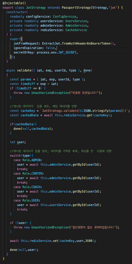 해당 작업은 토큰 검증을 담당하는 JwtStrategy 서비스에 적용되었다.